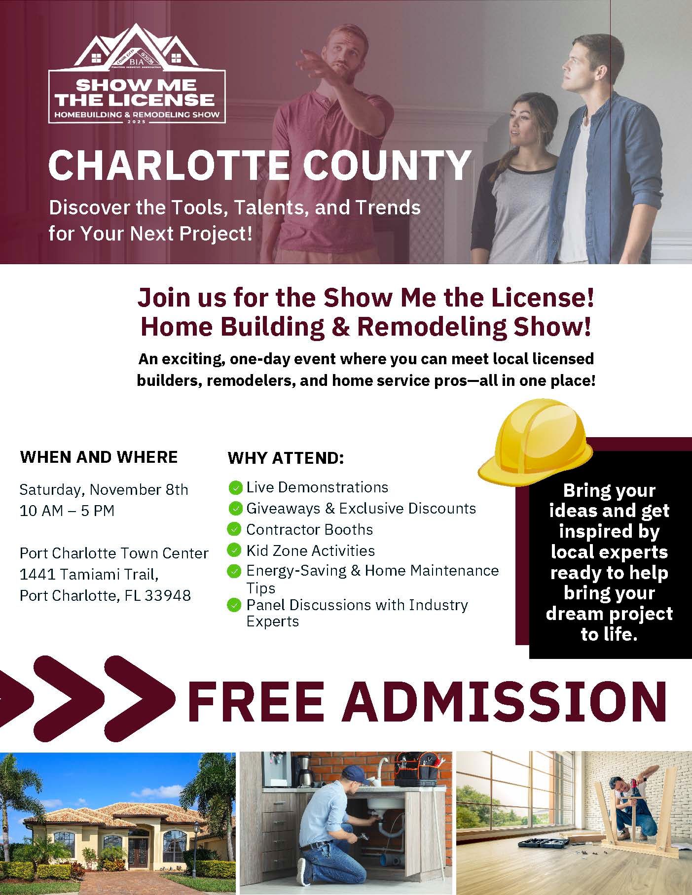 The Charlotte DeSoto Building Industry Association (CDBIA) is proud to present the inaugural “Show Me the License” Home Building & Remodeling Show, taking place on Saturday, November 8th from 10:00 a.m. to 5:00 p.m. at the Port Charlotte Town Center.